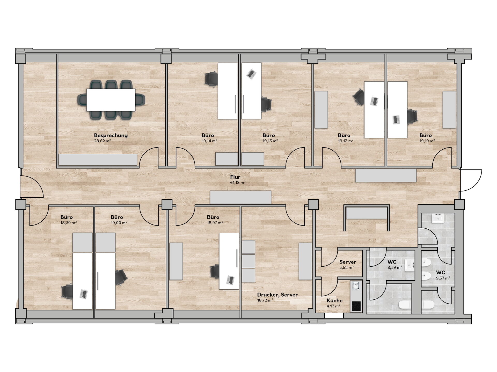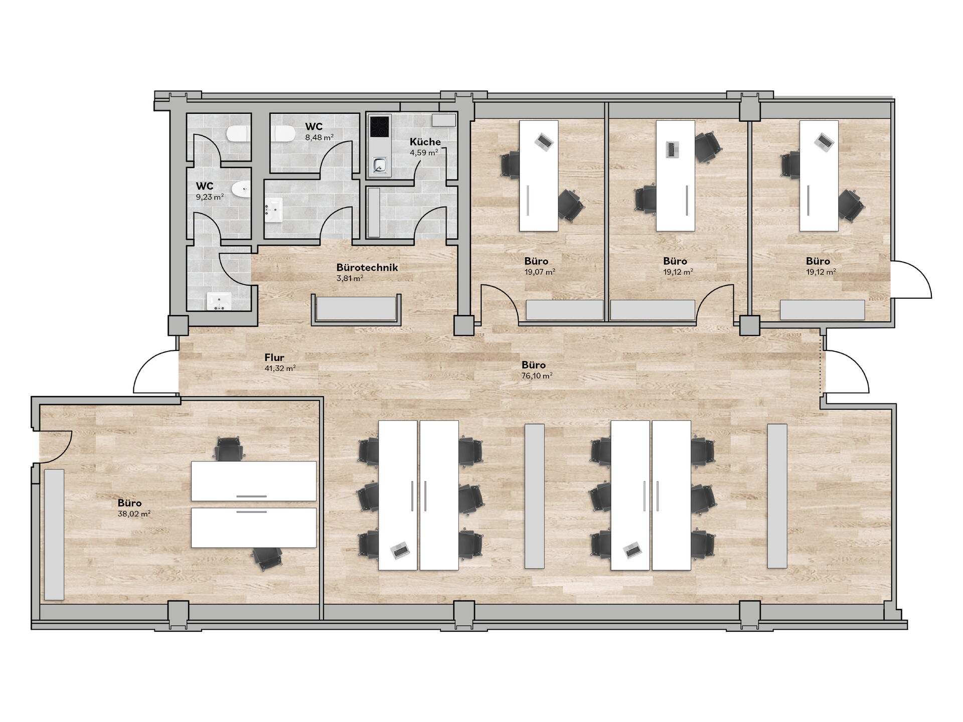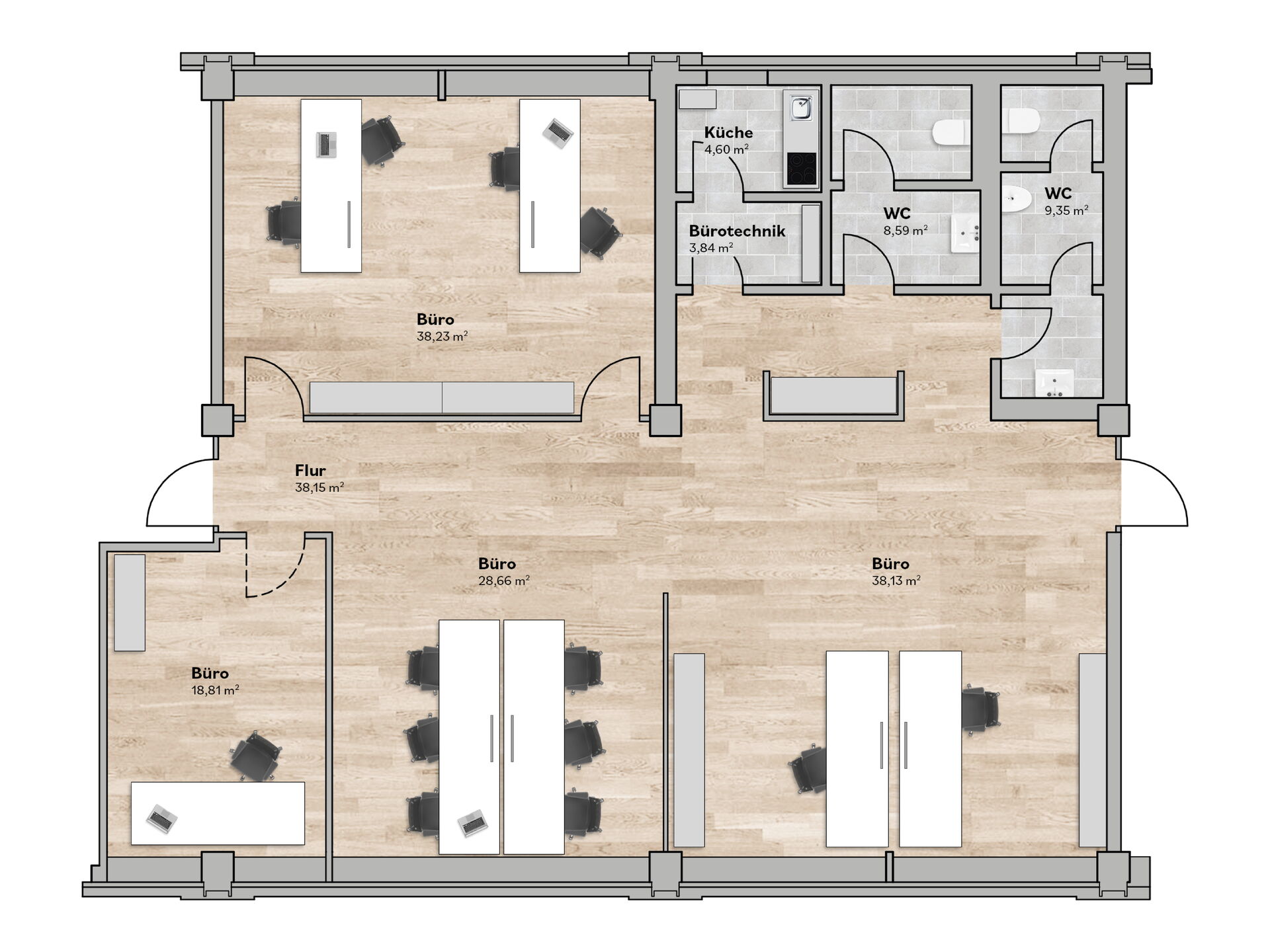 Dank des engmaschigen Gebäuderasters sind unterschiedlichste Raumkonzepte realisierbar: von klassischen Einzelbüros und funktionalen Teambüros über moderne Gruppen und Open-Space-Lösungen bis hin zu innovativen Arbeitswelten wie Activity-Based Working oder Co-Working-Spaces. So entstehen maßgeschneiderte Arbeitsbereiche, die effizientes Arbeiten, Zusammenarbeit und Kreativität optimal fördern und sich jederzeit an die Bedürfnisse Ihres Unternehmens anpassen lassen.