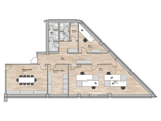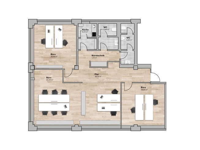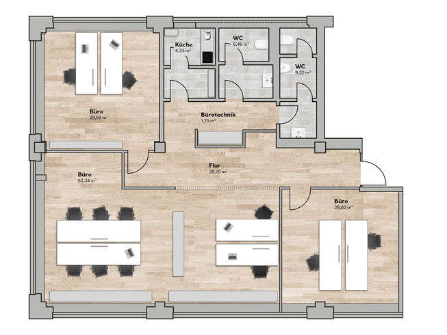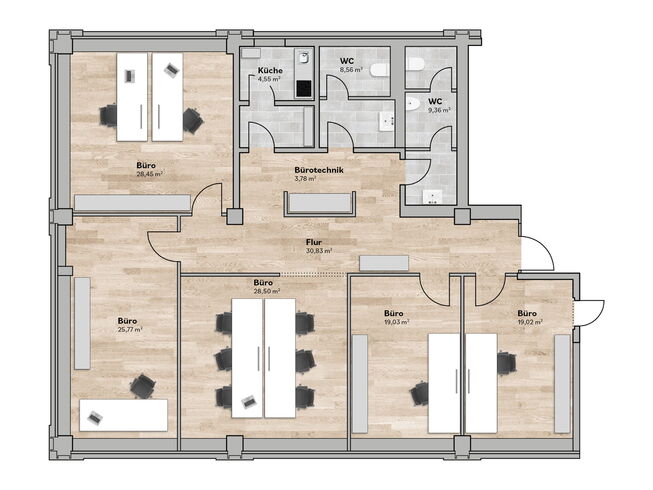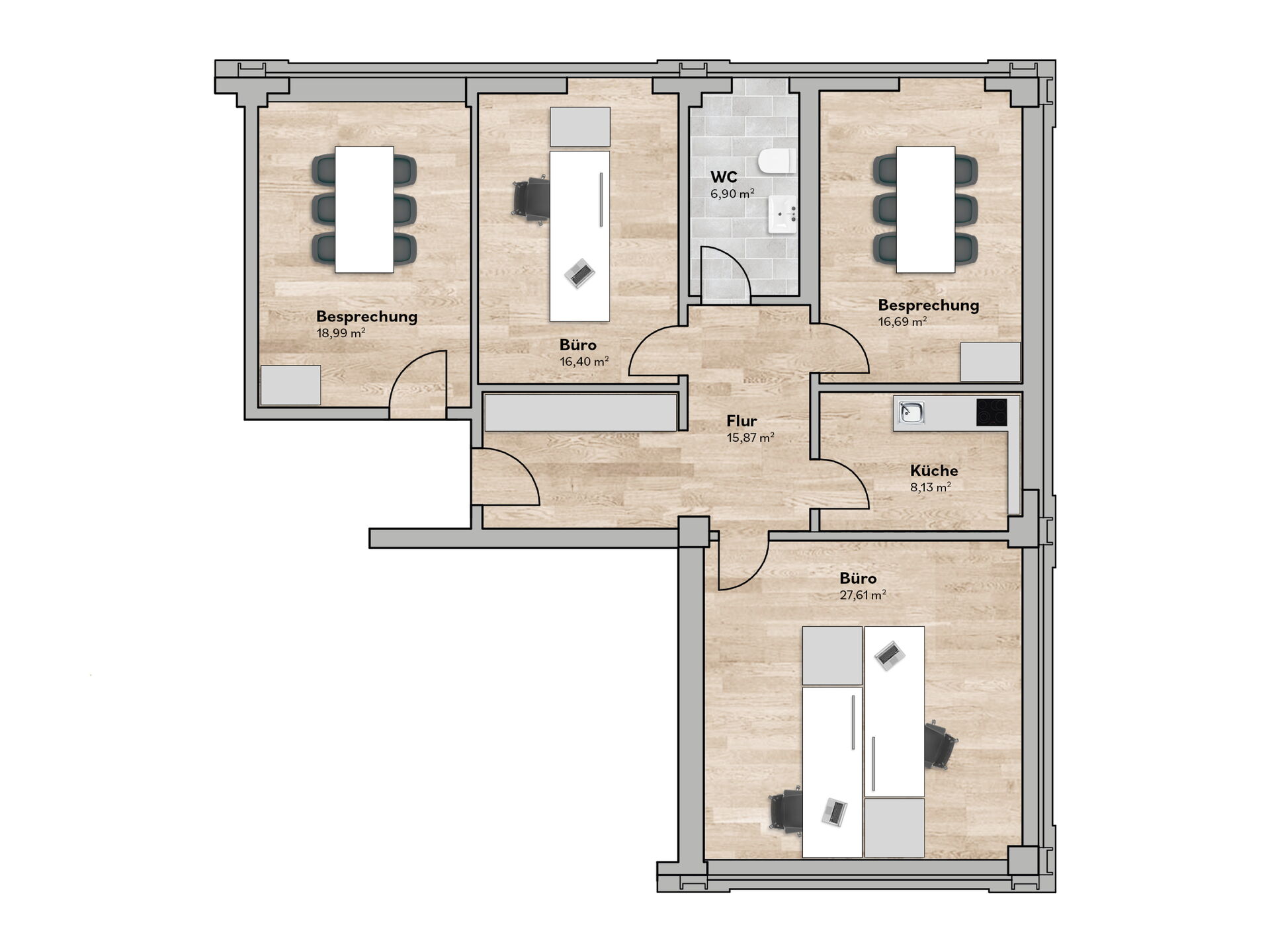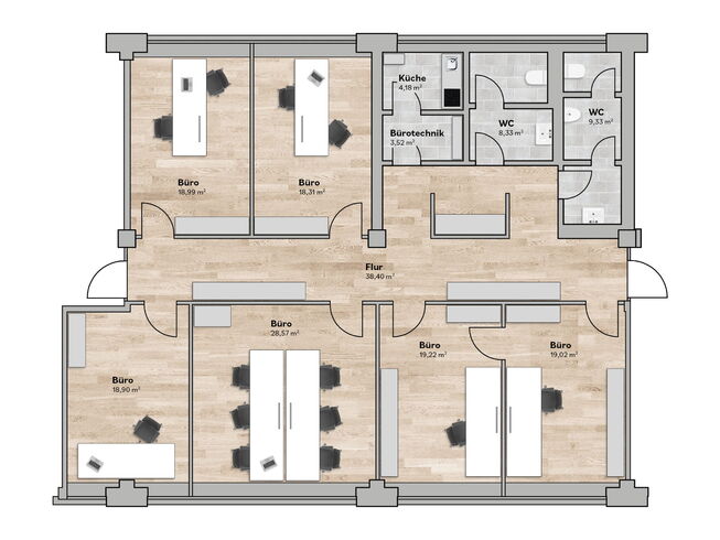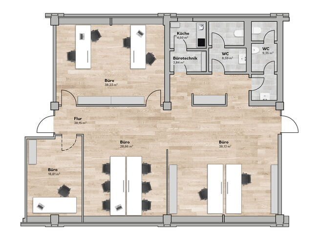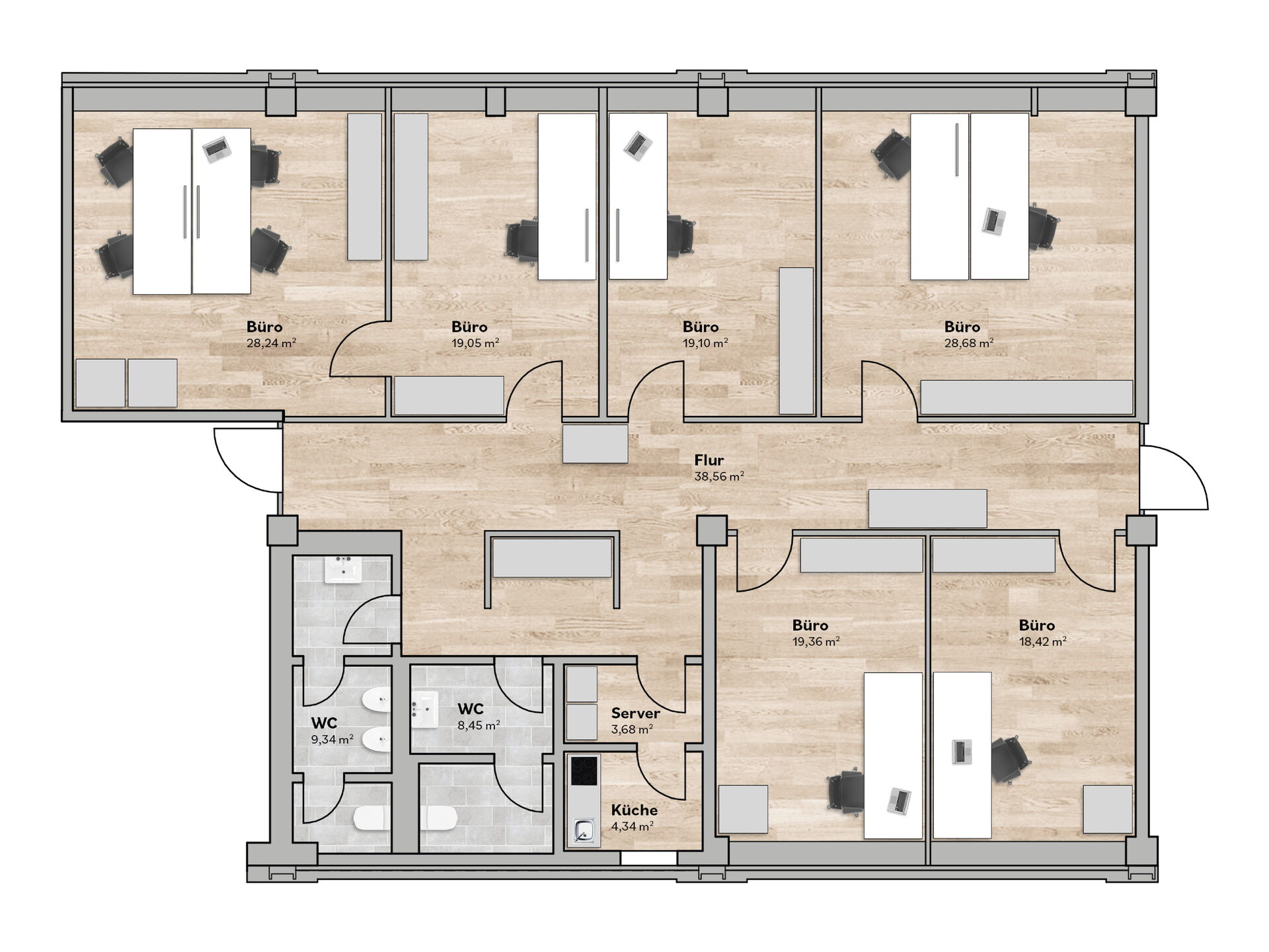 Dank des engmaschigen Gebäuderasters sind unterschiedlichste Raumkonzepte realisierbar: von klassischen Einzelbüros und funktionalen Teambüros über moderne Gruppen und Open-Space-Lösungen bis hin zu innovativen Arbeitswelten wie Activity-Based Working oder Co-Working-Spaces. So entstehen maßgeschneiderte Arbeitsbereiche, die effizientes Arbeiten, Zusammenarbeit und Kreativität optimal fördern und sich jederzeit an die Bedürfnisse Ihres Unternehmens anpassen lassen.
